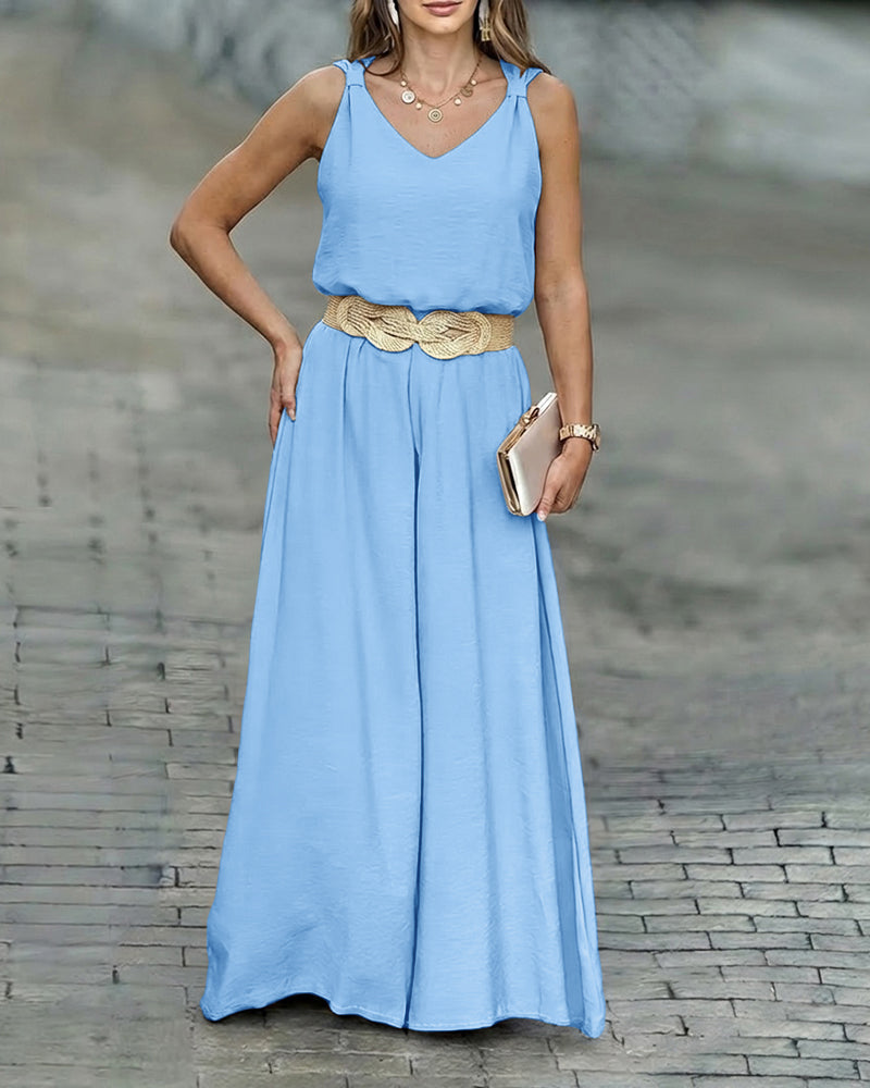 2 Pieces Outfit V-Neck Shoulder Bowknot Design Sleeveless Tank Top and Casual Zipper Fly Elastic Back Waist Wide Leg Pants Set without Belt-0119