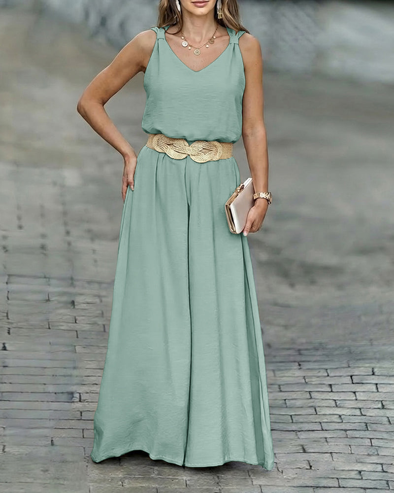 2 Pieces Outfit V-Neck Shoulder Bowknot Design Sleeveless Tank Top and Casual Zipper Fly Elastic Back Waist Wide Leg Pants Set without Belt-0119