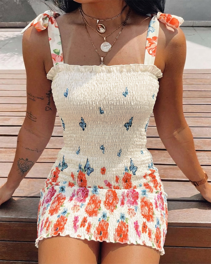 Butterfly & Floral Print Frill Trim Square Neck Bow Tie Shoulder Mini Dress Slim Fit Shirred Vacation Dress-0119