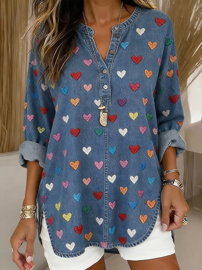 Women'S Casual Color-Block Top With Heart Print And Patchwork Design