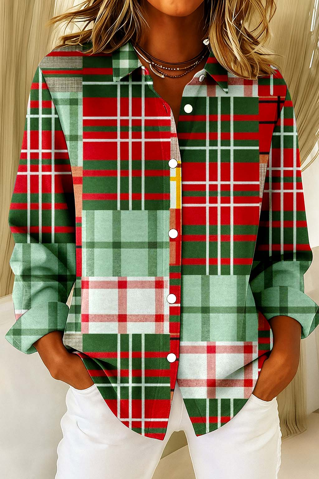 Women's Christmas irregular plaid stripes Pattern Print Casual Cotton Linen Shirt
