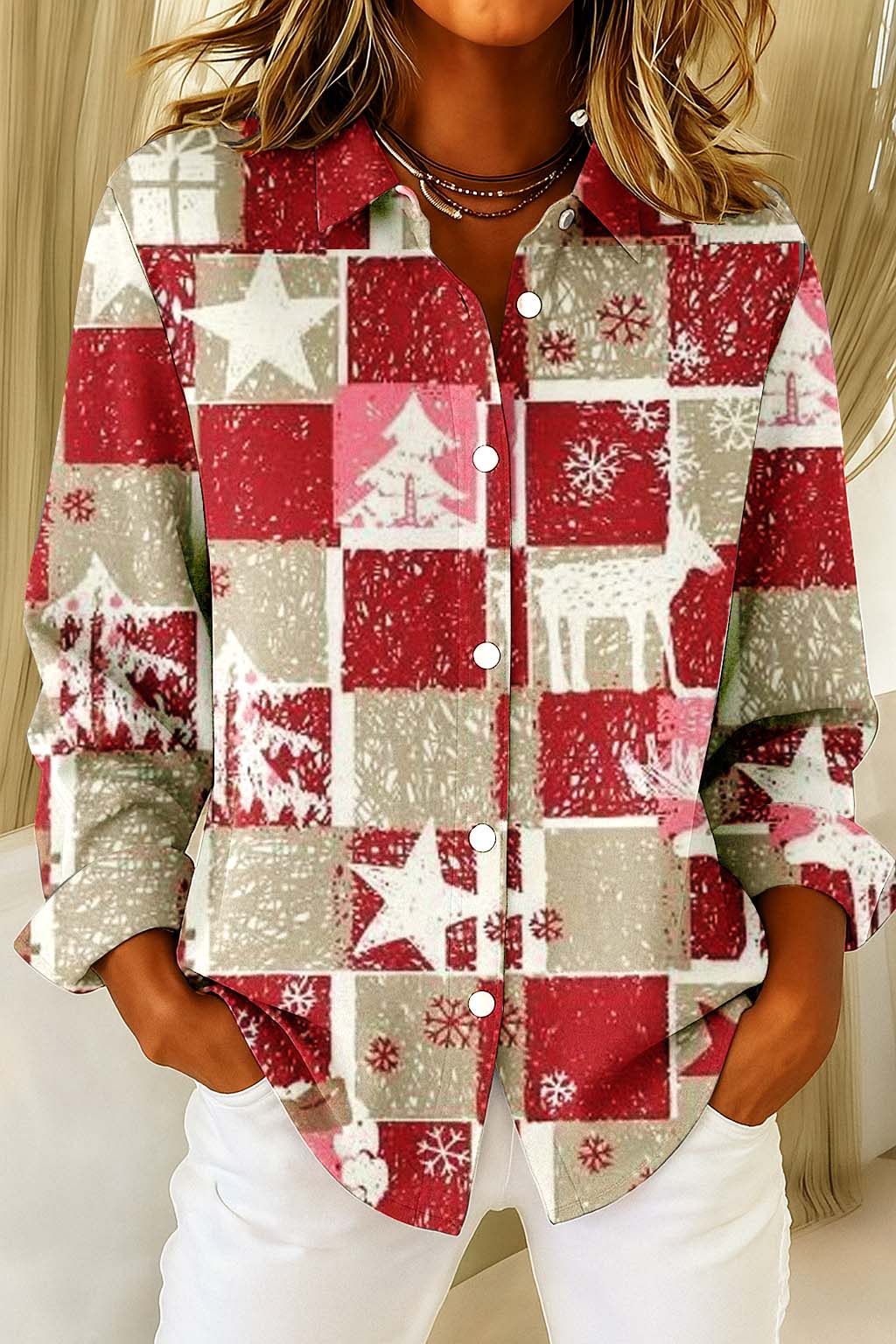 Women's Christmas Vintage Recovered Rubbings Pattern Print Casual Cotton Linen Shirt