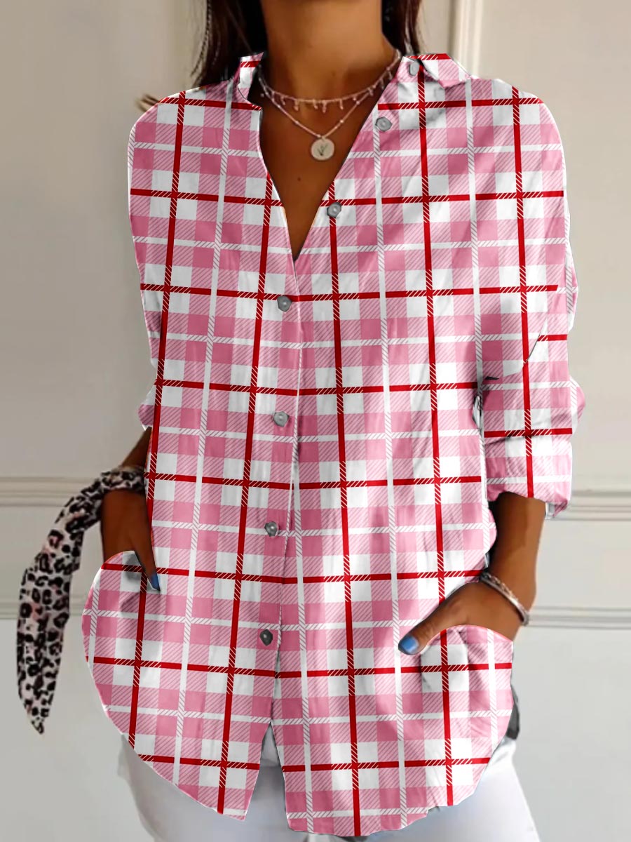 Women'S Pink Plaid Pattern Casual Linen V-Neck Shirt