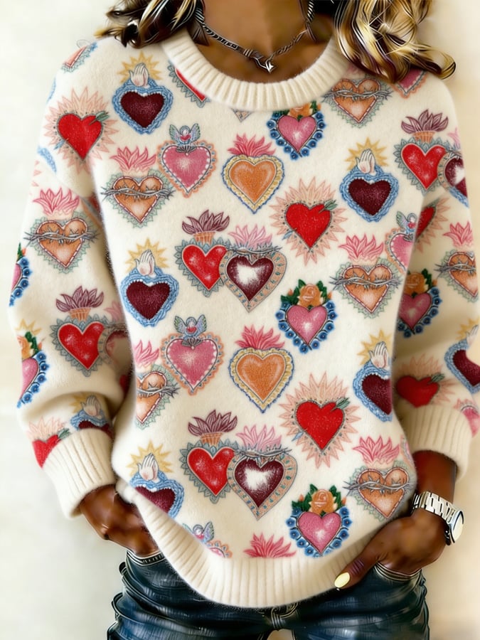 Women's Valentine's Day heart-print long-sleeved knitted top